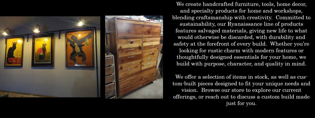 Home Our site is under construction at the moment. Pardon the inconvenience. You can follow us on Facebook at RyanWSMS for updates. Thank you! Crafting Unique Furniture, Tools, and Decor Ryanaissance Turning the Unwanted into the Unforgettable In Stock Online store coming soon! Check back in or follow us on Facebook and instagrams for updates! Browse Store Videos and Tutorials Editing is a LOT of work, but we have a library of production videos as well as tutorials to help you with your projects. We’ll get ’em up as quick as we can!